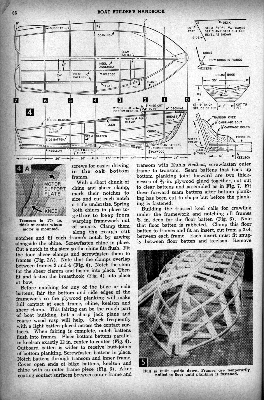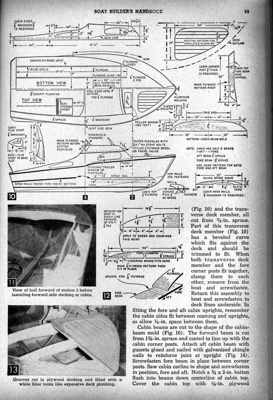 Sea Babe - By WILLIAM D. JACKSON. N.A. Crusing comfort plus runabout speed are packed into 15ft... Sea Babe. For extended cruising along river and lake routes, winding through the many picturesque canal routes, or for short week-end hops that require frequent launching and beaching, you'll find Sea Babe easy to handle and economical to run. With the motor removed, she weighs only 450 lbs.. and her 15-ft. hull handles easily on a 2-wheel trailer. And performance! The light weight and the advanced design of the hull battom practically eliminate power-wasting spray, and boost Sea Babe's speed 2-5 mph over most outboard cruisers powered by identical motors. Trussed keel construction builds in strength without weight. She rides softly and without pounding. With motor attached. she floats in only 2 in. of water. The low silhouette and sporty lines make you think Sea Babe is bigger than her 15-ft length. In the 7-ft cockpit, there's plenty of room for fishing plus two chairs, one for the skipper. The simple framework and plywnod planking make her easy to build, so let's get started.