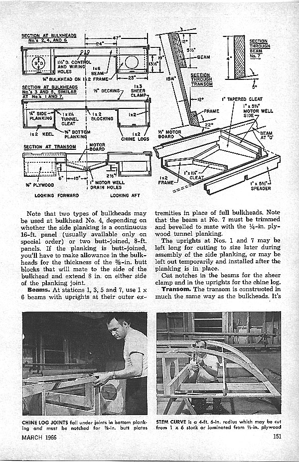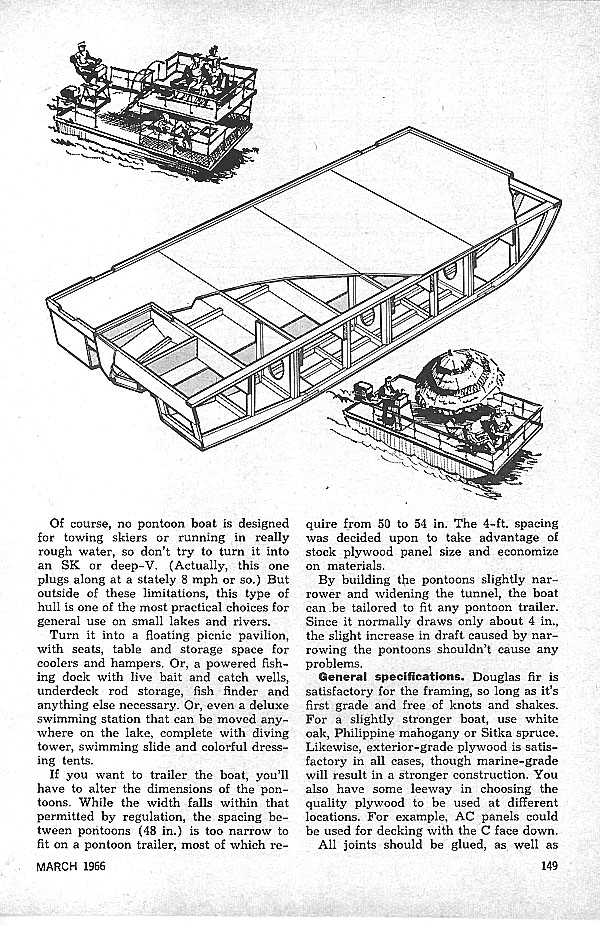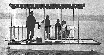 PM’S Platform Boat - By Art Mikesell. You can build any kind of floating fun on top of it. We give you plans for the pontoons and deck. You Take it from there. Start with this easy to build pontoon platform and you'll have no trouble turning out a customized boat exactly to suit your needs. Of course on pontoon boat is designed for towing skiers or running in really rough water so dont try to turn it into a ski or deep-V. Actually, this one plugs along at a stately 8 mph or so. But outside of these limitations, this type of hull is one of the most practical choices for general use on small lakes and rivers. Turn it into a floating picnic pavillion, with seats, table, and stonge space for coolers and hampers. Or, a powered fishing dock with live bait, catch wells, underdeck rod storage, fish finder and anything else necessary. Or even a delux swimming station that can be moved anywhere on the lake, complete with diving tower, swimming slide, and colorful dressing tents.