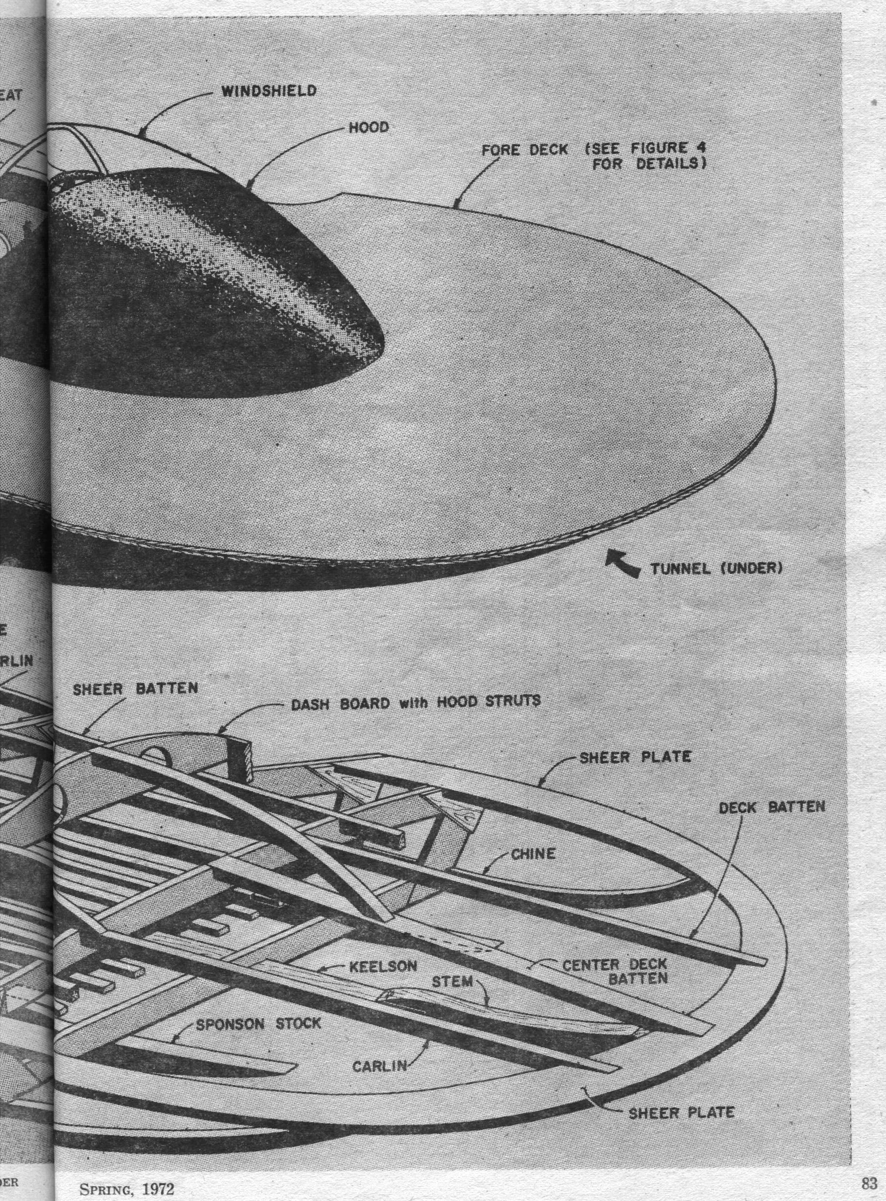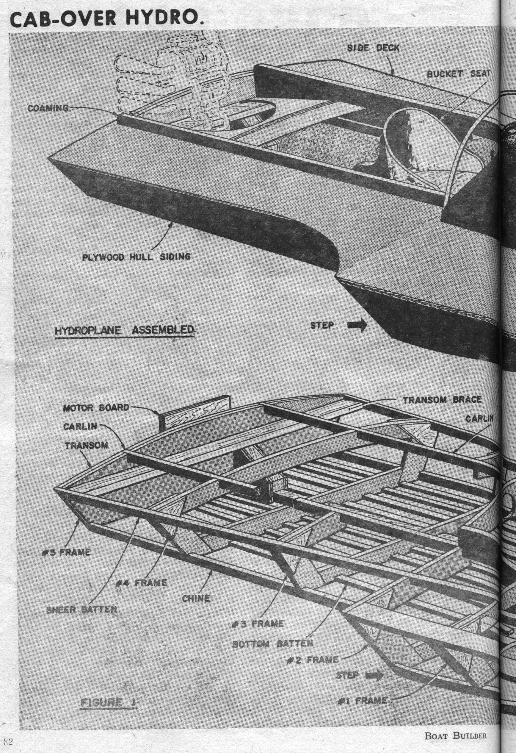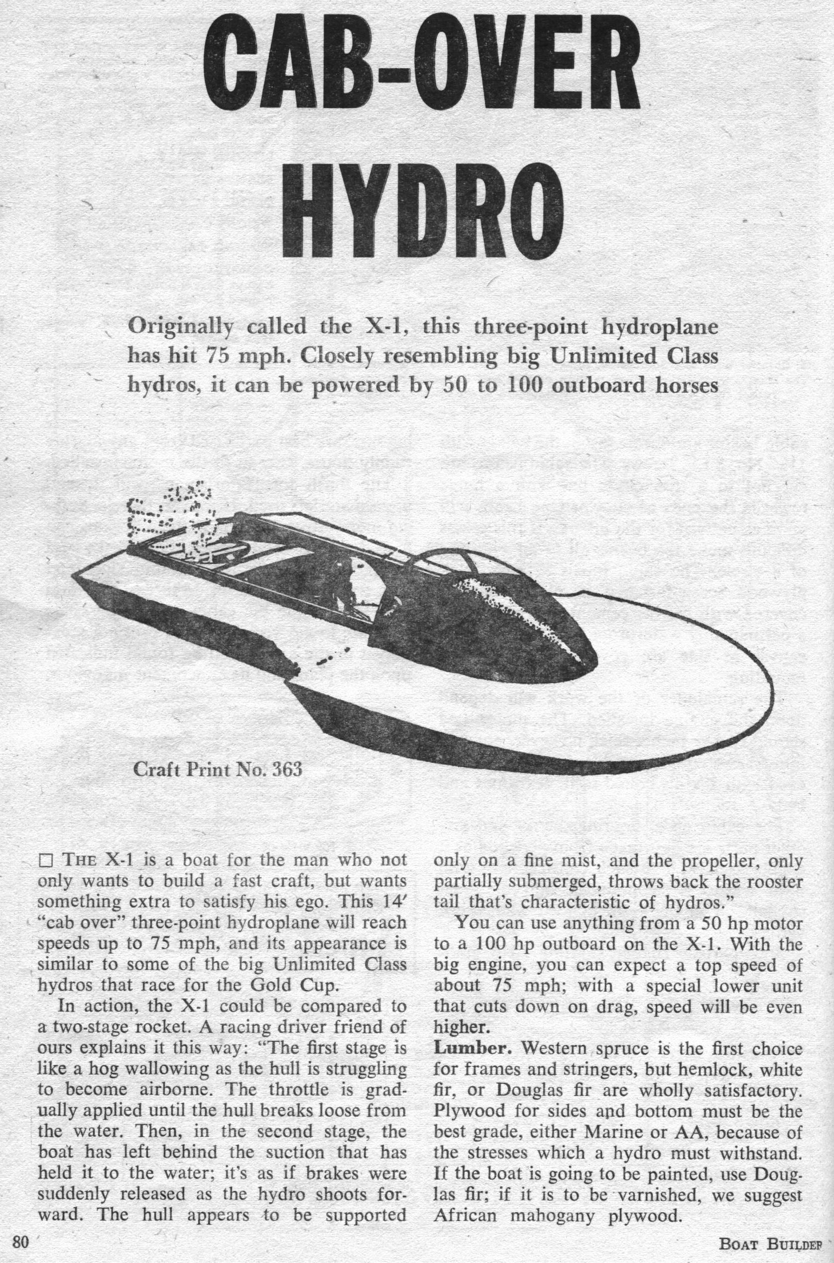 80 Cab-Over Hydroplane - Originally called the X-1, this three-point hydroplane has hit 75 mph. Closely resembling big Unlimited Class hydros, it can be powered by 50 to 100 outboard horses The X-1 is a boat for the person who not only wants to build a fast craft, but wants something extra to satisfy his ego. This 14’ “cab over” three-point hydroplane will reach speeds up to 75 mph, and its appearance is similar to some of the big Unlimited Class hydros that race for the Gold Cup. In action, the X-1 could be compared to a two-stage rocket. A racing driver friend of ours explains it this way: “The first stage is like a hog wallowing as the hull is struggling to become airborne. The throttle is gradually applied until the hull breaks loose from the water. Then, in the second stage, the boat has left behind the suction that has held it to the water; it‘s as if brakes were suddenly released as the hydro shoots for ward. The hull appears to be supported only on a fine mist, and the propeller, only partially submerged, throws back the rooster tail that‘s characteristic of hydros.” You can use anything from a 50 hp motor to a 100 hp outboard on the X-1. With the big engine. you can expect a top speed of about 75 mph; with a special lower unit that cuts down on drag, speed will be even higher.