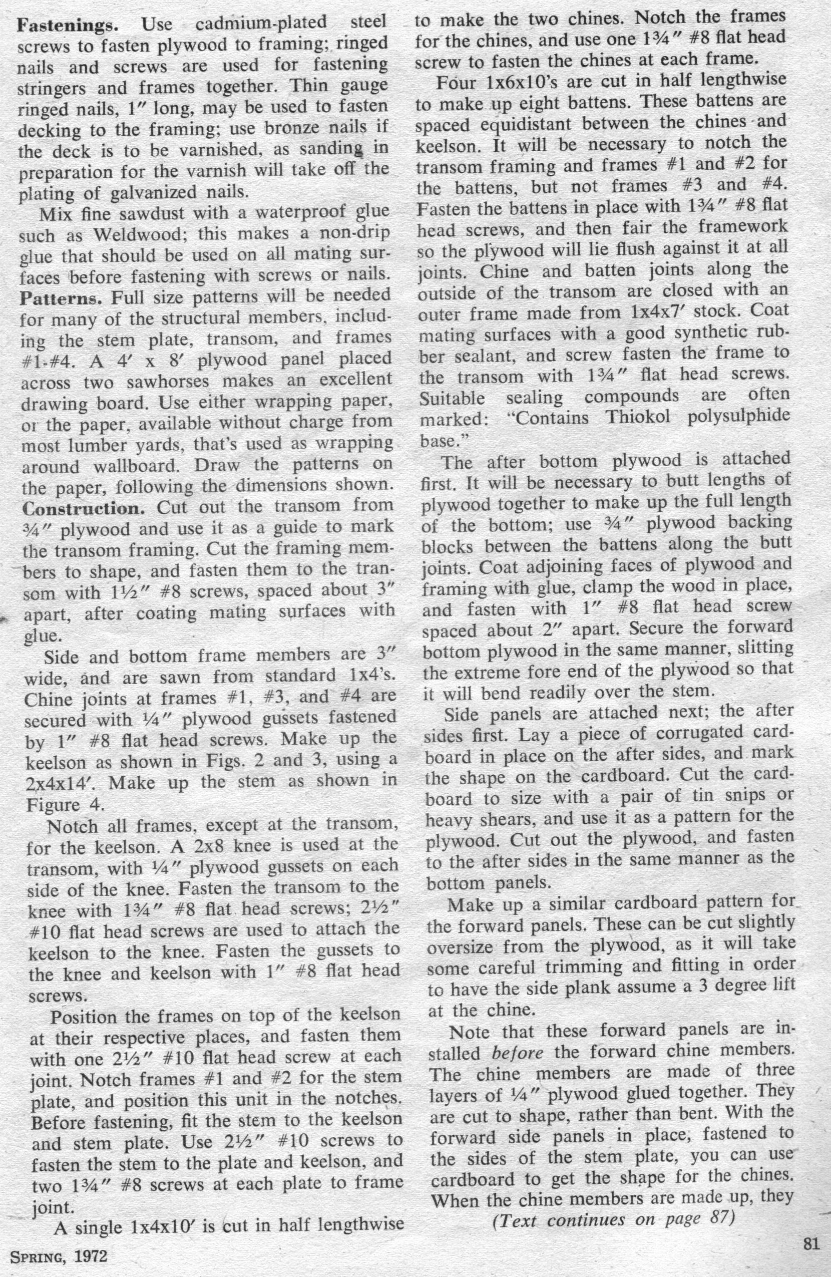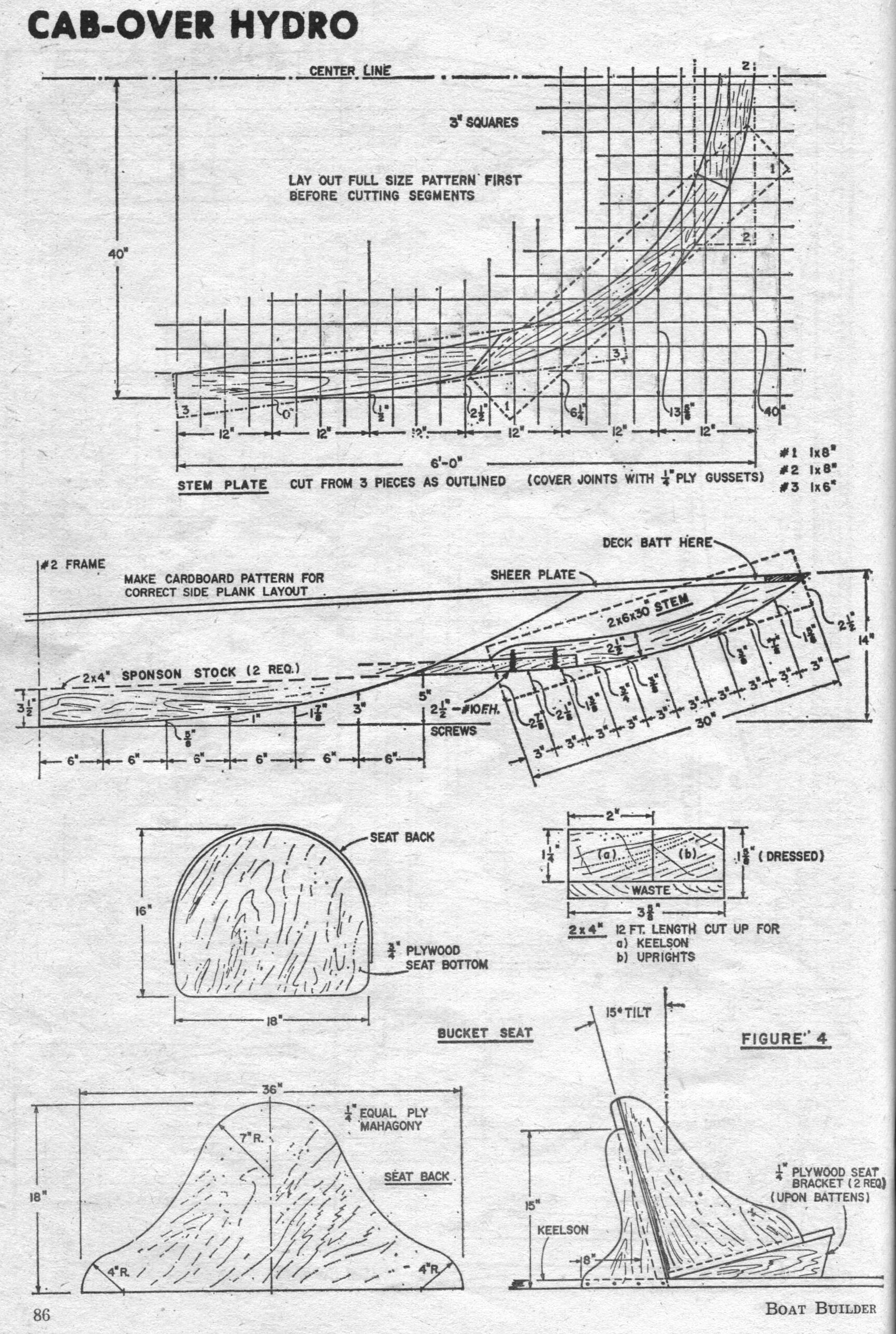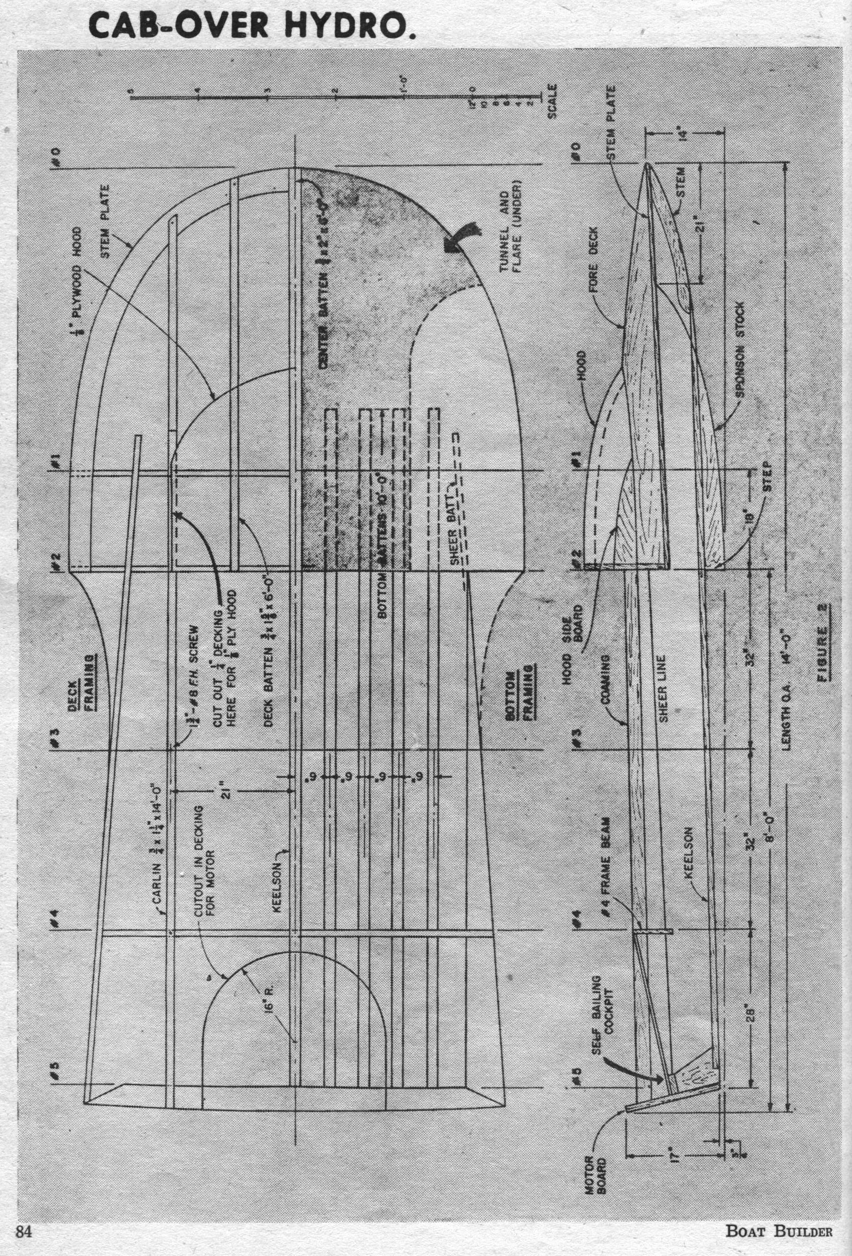 80 Cab-Over Hydroplane - Originally called the X-1, this three-point hydroplane has hit 75 mph. Closely resembling big Unlimited Class hydros, it can be powered by 50 to 100 outboard horses The X-1 is a boat for the person who not only wants to build a fast craft, but wants something extra to satisfy his ego. This 14’ “cab over” three-point hydroplane will reach speeds up to 75 mph, and its appearance is similar to some of the big Unlimited Class hydros that race for the Gold Cup. In action, the X-1 could be compared to a two-stage rocket. A racing driver friend of ours explains it this way: “The first stage is like a hog wallowing as the hull is struggling to become airborne. The throttle is gradually applied until the hull breaks loose from the water. Then, in the second stage, the boat has left behind the suction that has held it to the water; it‘s as if brakes were suddenly released as the hydro shoots for ward. The hull appears to be supported only on a fine mist, and the propeller, only partially submerged, throws back the rooster tail that‘s characteristic of hydros.” You can use anything from a 50 hp motor to a 100 hp outboard on the X-1. With the big engine. you can expect a top speed of about 75 mph; with a special lower unit that cuts down on drag, speed will be even higher.