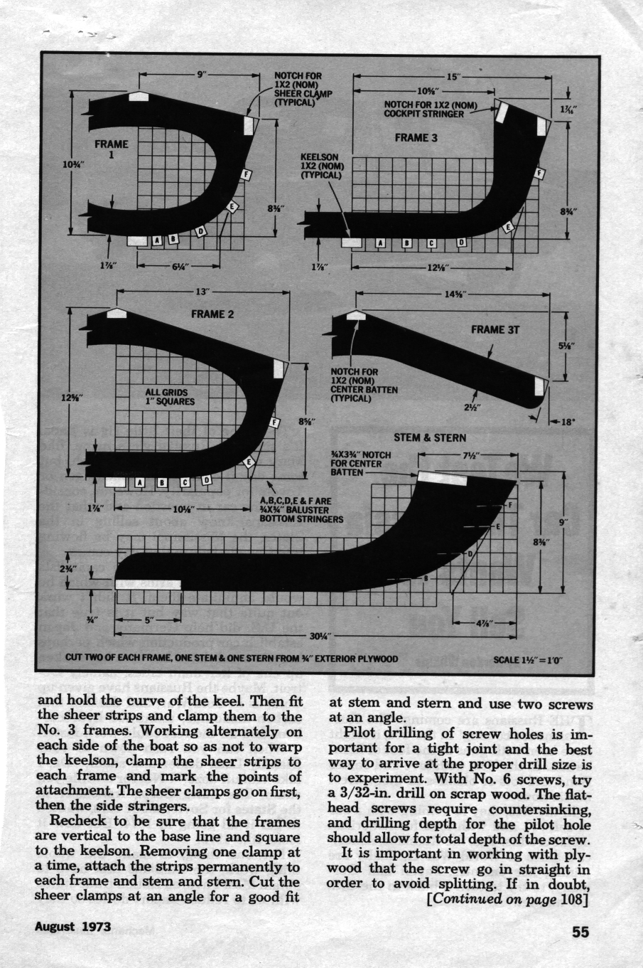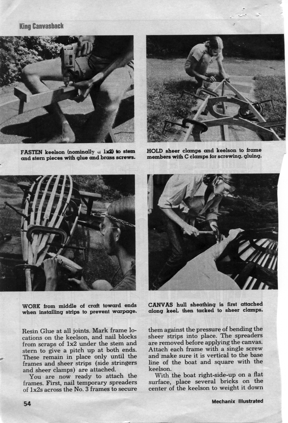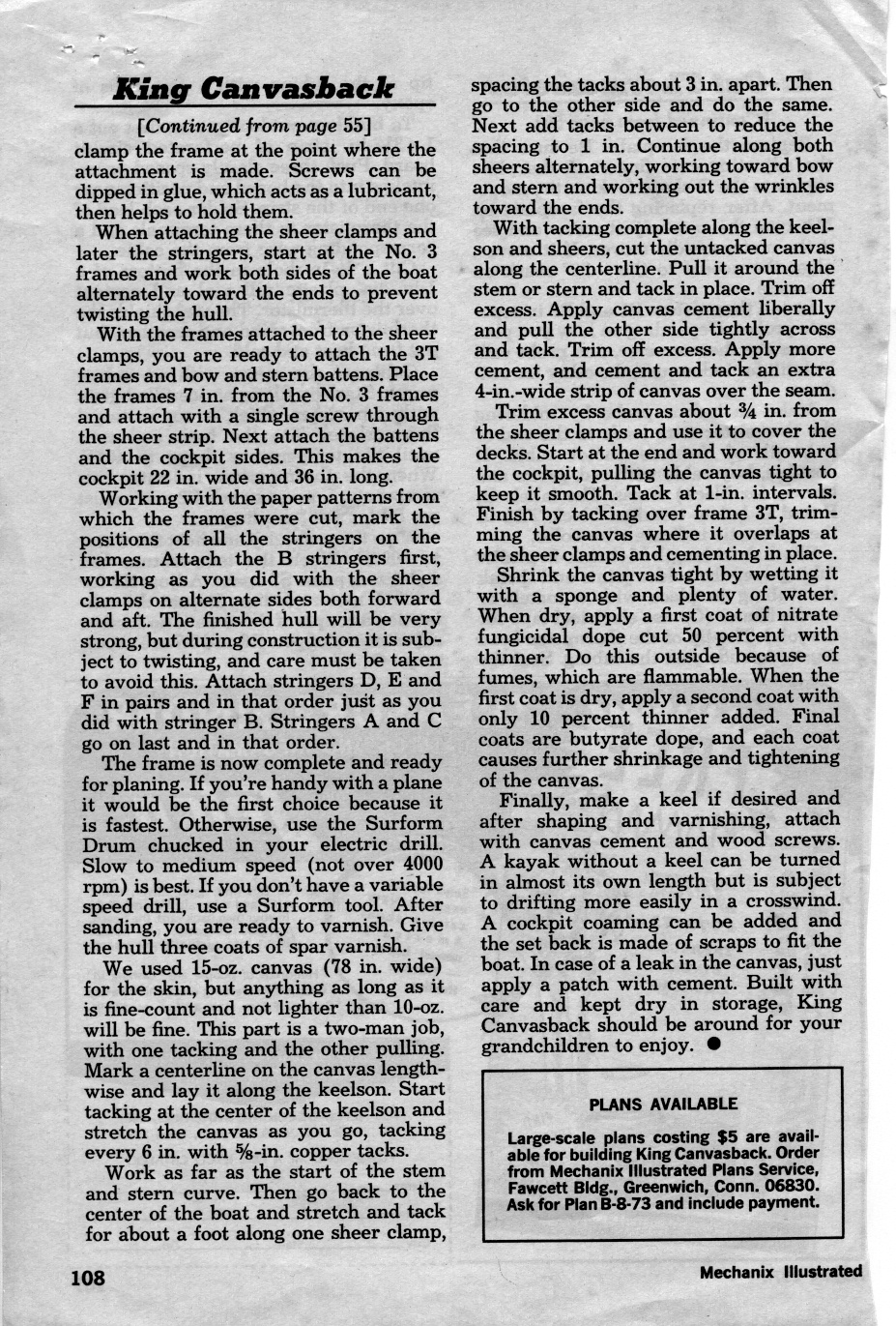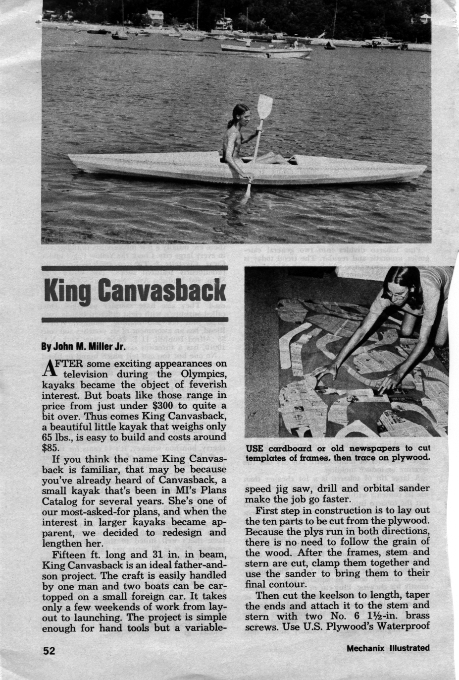 King Canvasback - By John M. Miller Jr. After some exciting appearances on television during the Olympics, kayaks became the object of feverish interest. But boats like those range in price from just under $300 to quite a bit over. Thus comes King Canvasback, a beautiful little kayak that weighs only 65 lbs. and is easy to build If you think the name King Canvasback is familiar, that may be because you’ve already heard of Canvasback, a small kayak that's been in MI's Plans Catalog for several years. She's one of our most asked for plans, and when the interest in larger kayaks became apparent, it was decided to redesign and lengthen her. Fifteen feet long and 31 in. in beam, King Canvasback is an ideal father and son project, The craft is easily handled by one man and two boats can be car topped on a small car. It takes only a few weekends of work from lay out to launching. The project is simple enough for hand tools but a variable speed jig saw, drill and orbital sander make the job go faster.
