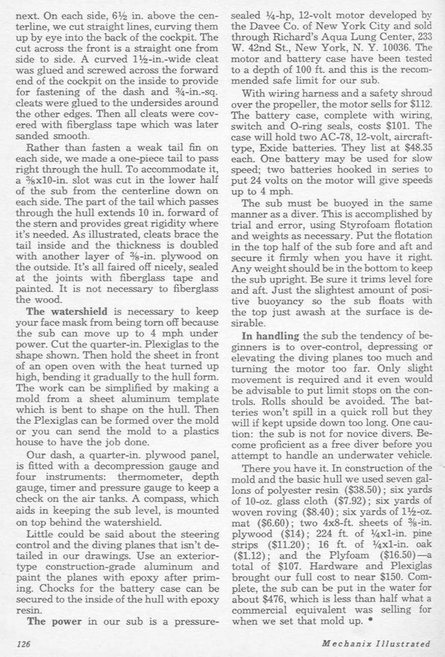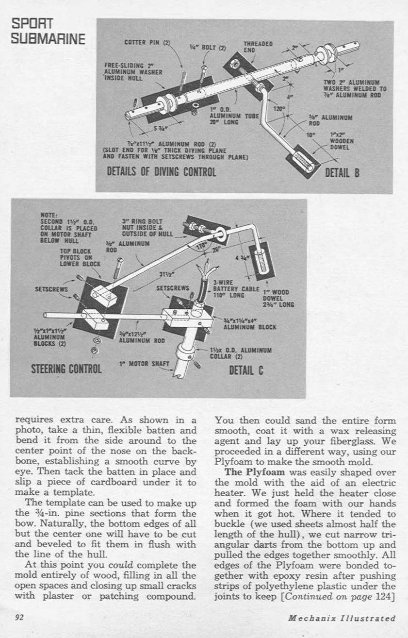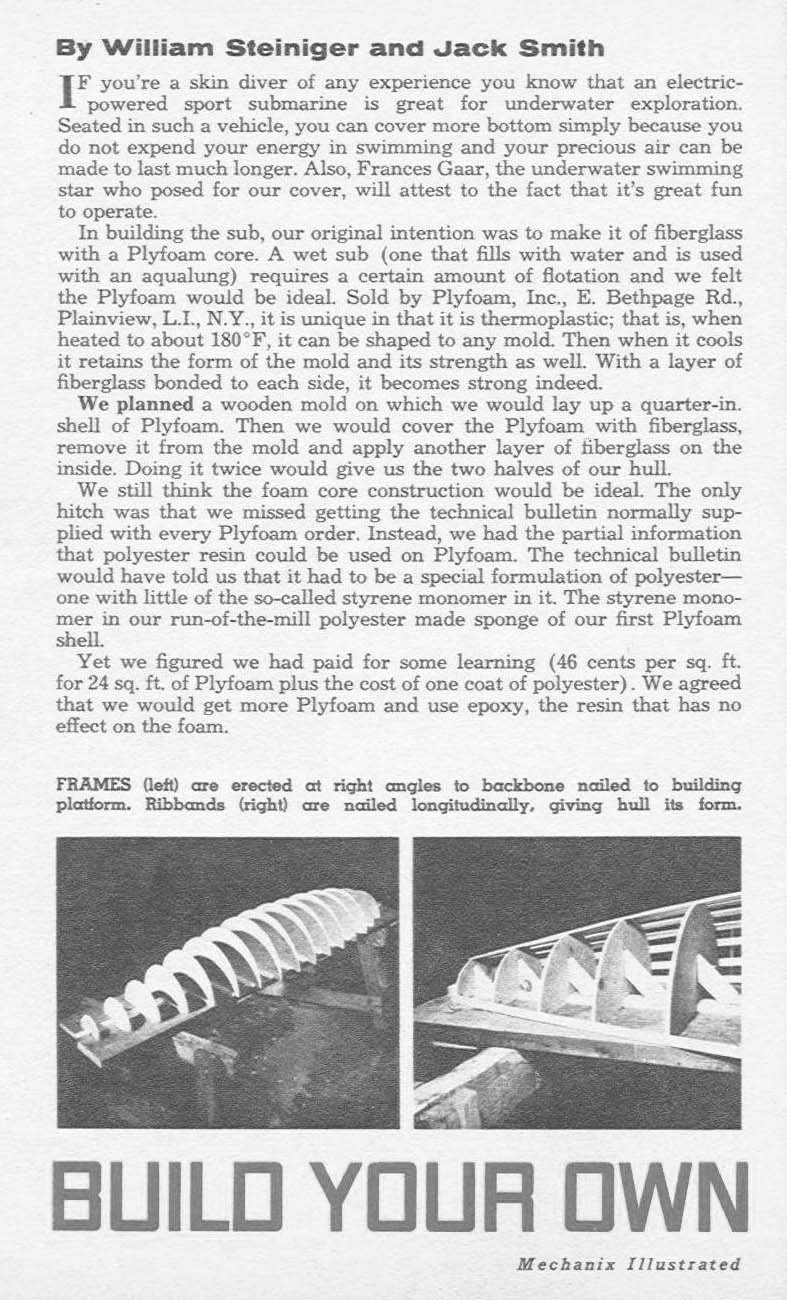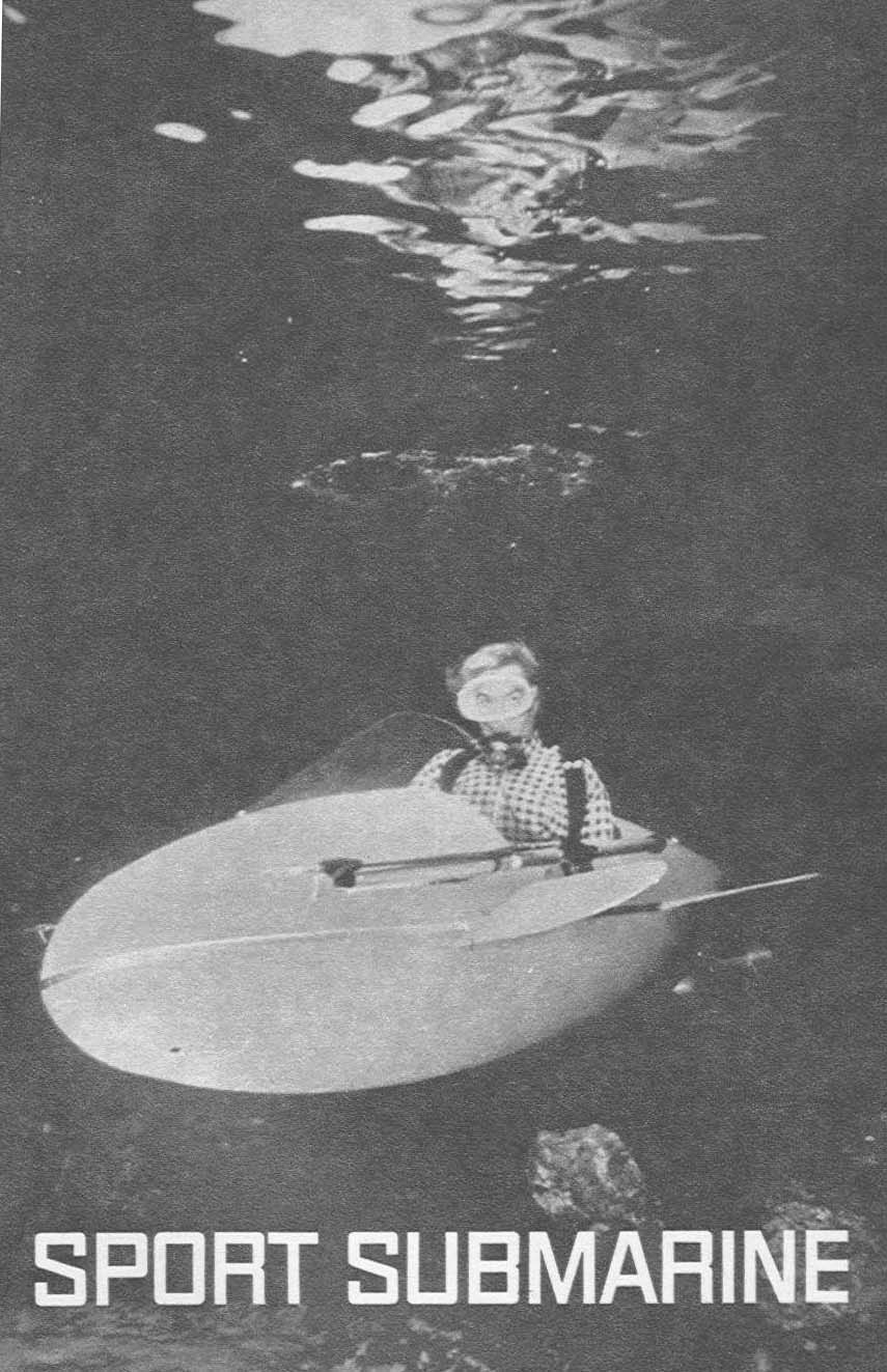 Sport Sub - By William Sleiniger and Jack Smith. If you're a skin diver of any experience you know that an electric powered sport submarine is great for underwater exploration. Seated in such a vehicle, you can cover more bottom simply because you do not expend your energy in swimming and your precious air can be made to last much longer. Also, Frances Gaar, the underwater swimming star who posed for our cover, will attest to the fact that it's great fun to operate.