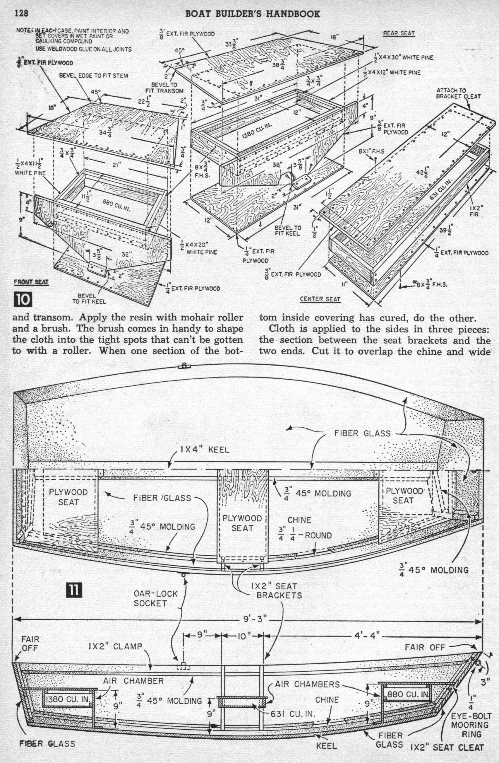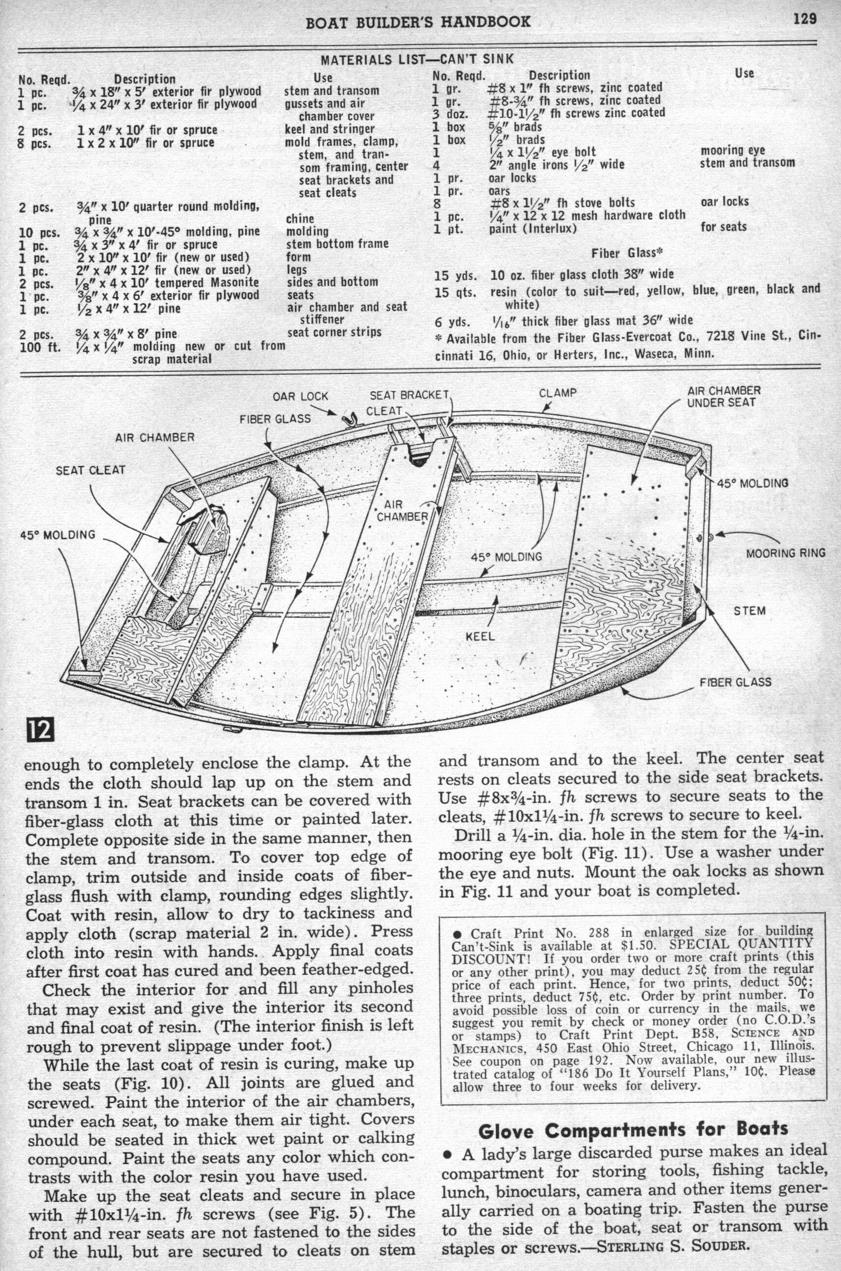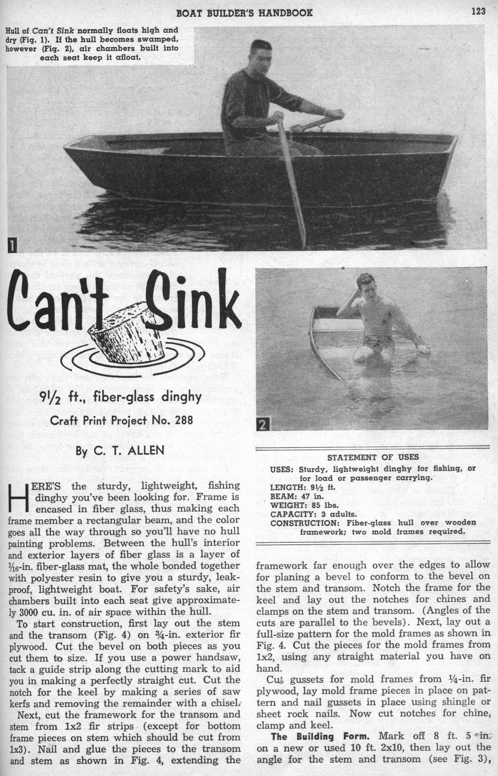 Can't Sink - By C. T. Allen. Hull of Can't Sink normally floats high and dry. If the hull becomes swamped, however, air chambers built into each seat keep it afloat. Here's the sturdy, lightweight, fishing dinghy you've been looking for. Frames are encased in fiber glass, thus making each frame member a rectangular beam, and the color goes all the way through so you'll have no hull painting problems. Between the hull's interior and exterior layers of fiber glass is a layer of 1/16-in. fiber-glass mat, the whole, bonded together with polyester resin to give you a sturdy, leak proof, lightweight boat. For safety's sake, air chambers built into each seat give approximately 3000 cu. in. of air space within the hull.