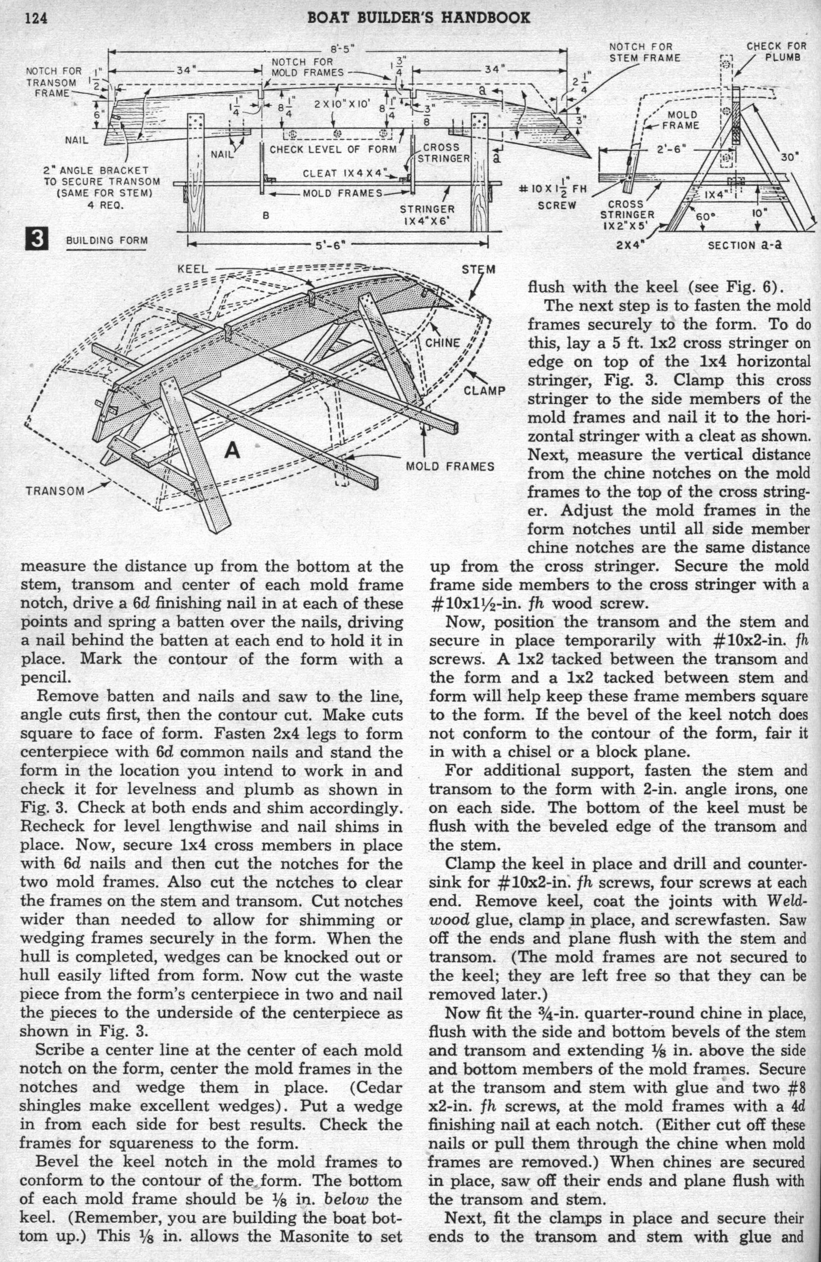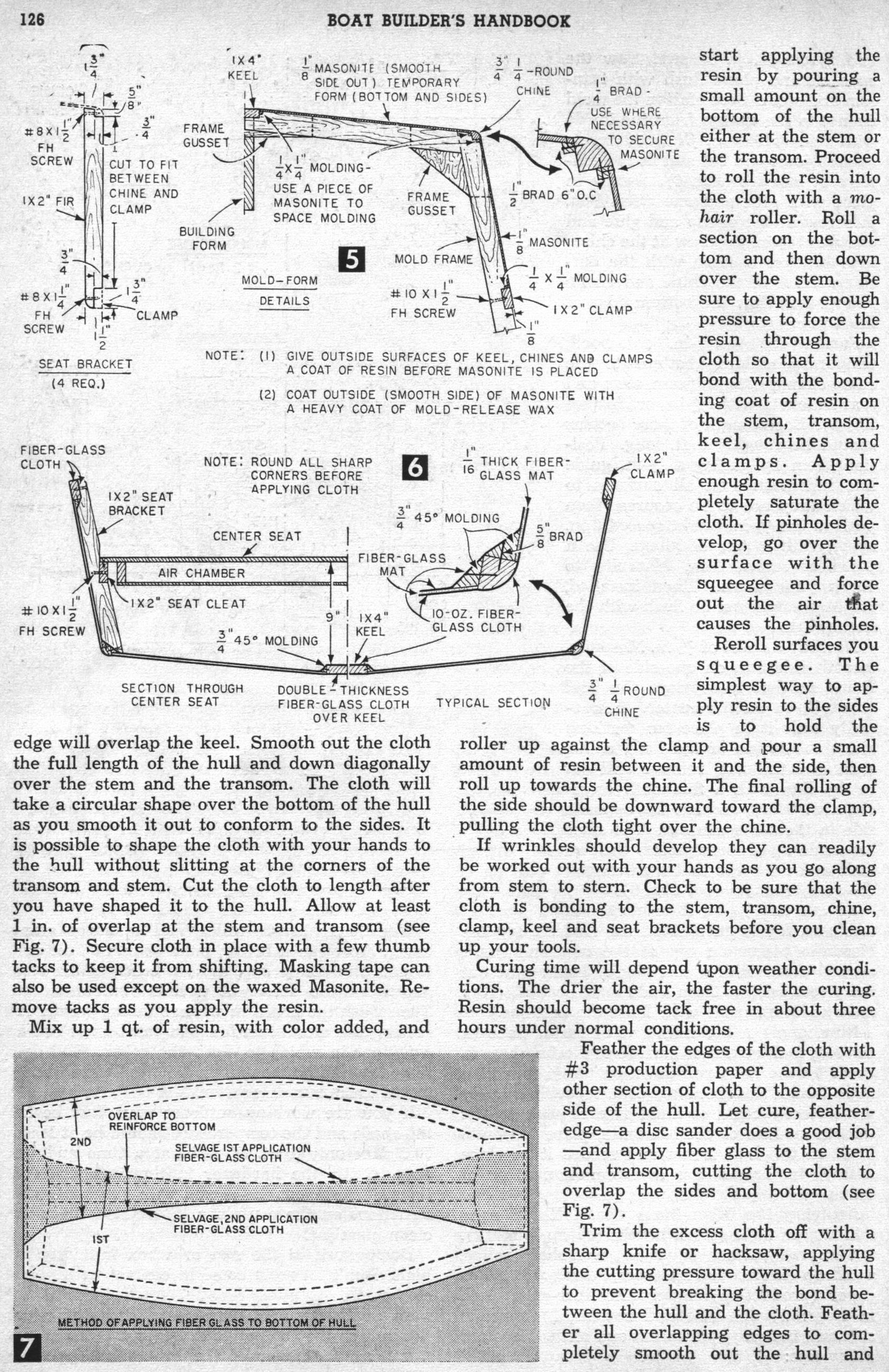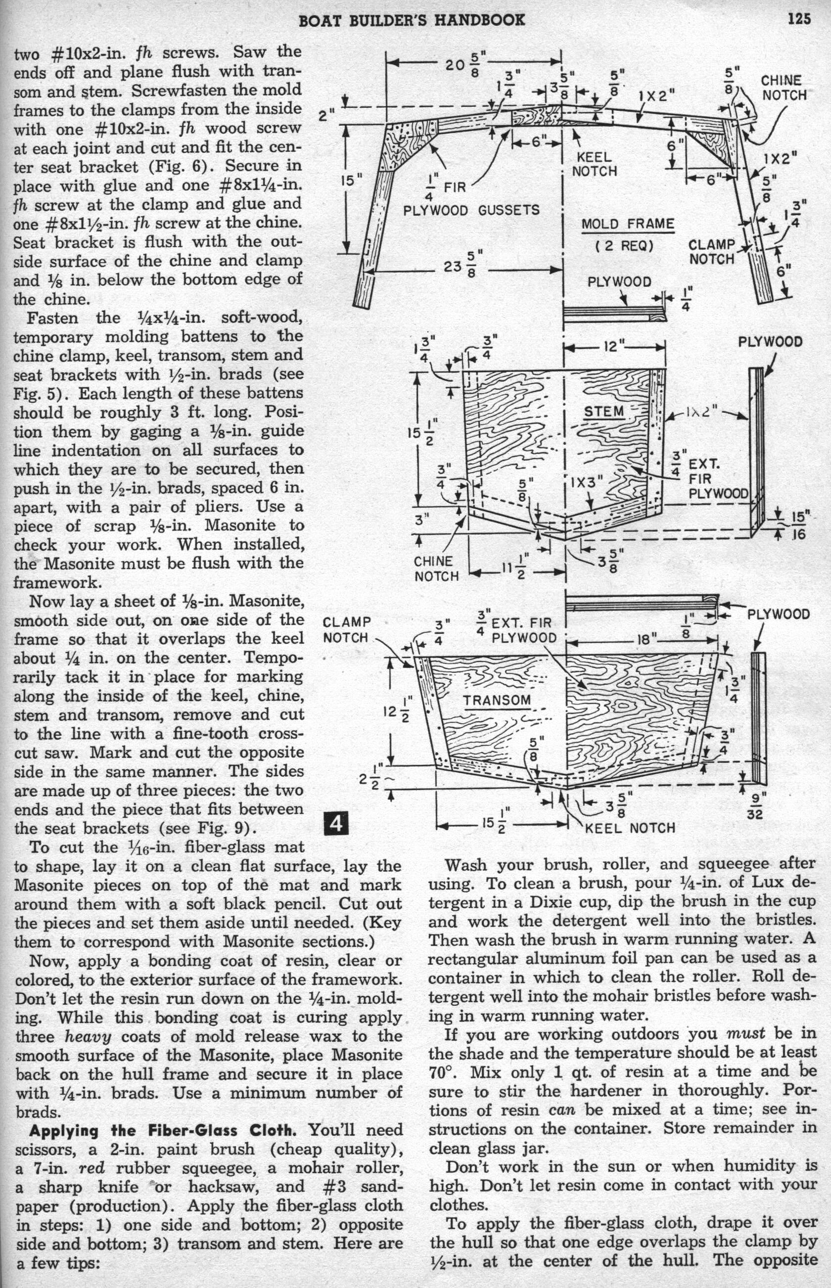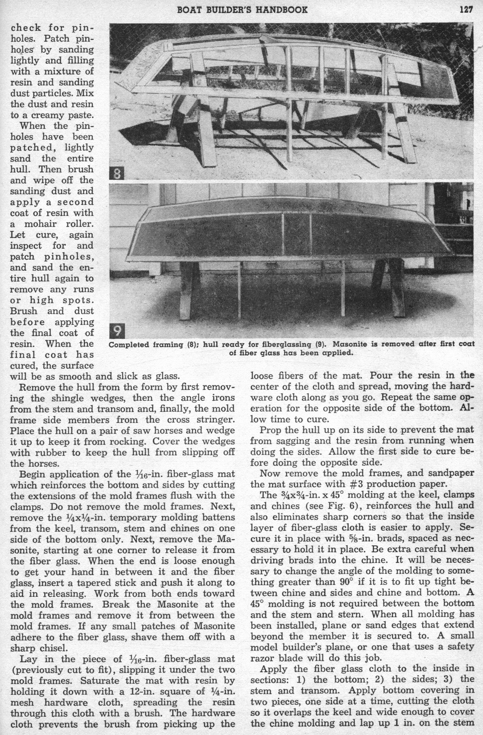 Can't Sink - By C. T. Allen. Hull of Can't Sink normally floats high and dry. If the hull becomes swamped, however, air chambers built into each seat keep it afloat. Here's the sturdy, lightweight, fishing dinghy you've been looking for. Frames are encased in fiber glass, thus making each frame member a rectangular beam, and the color goes all the way through so you'll have no hull painting problems. Between the hull's interior and exterior layers of fiber glass is a layer of 1/16-in. fiber-glass mat, the whole, bonded together with polyester resin to give you a sturdy, leak proof, lightweight boat. For safety's sake, air chambers built into each seat give approximately 3000 cu. in. of air space within the hull.