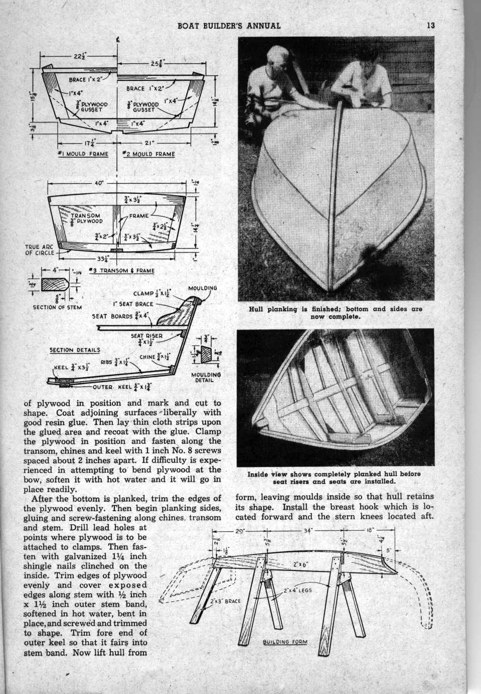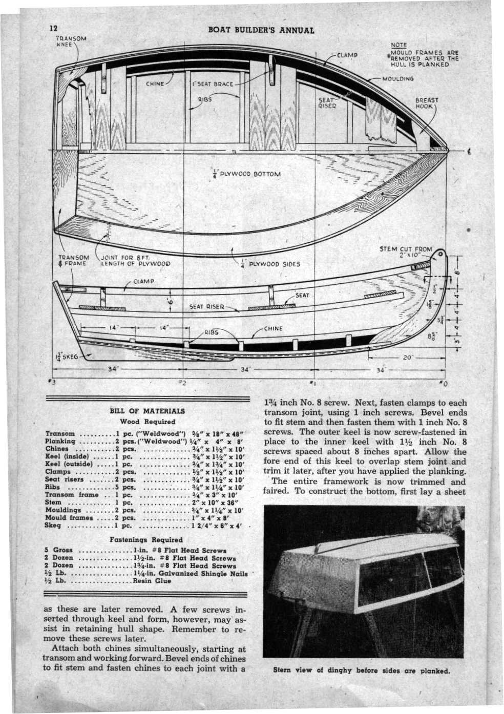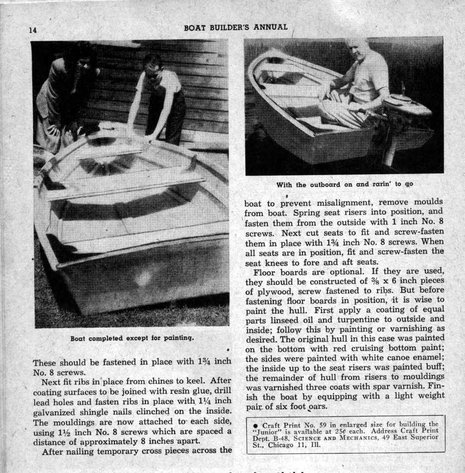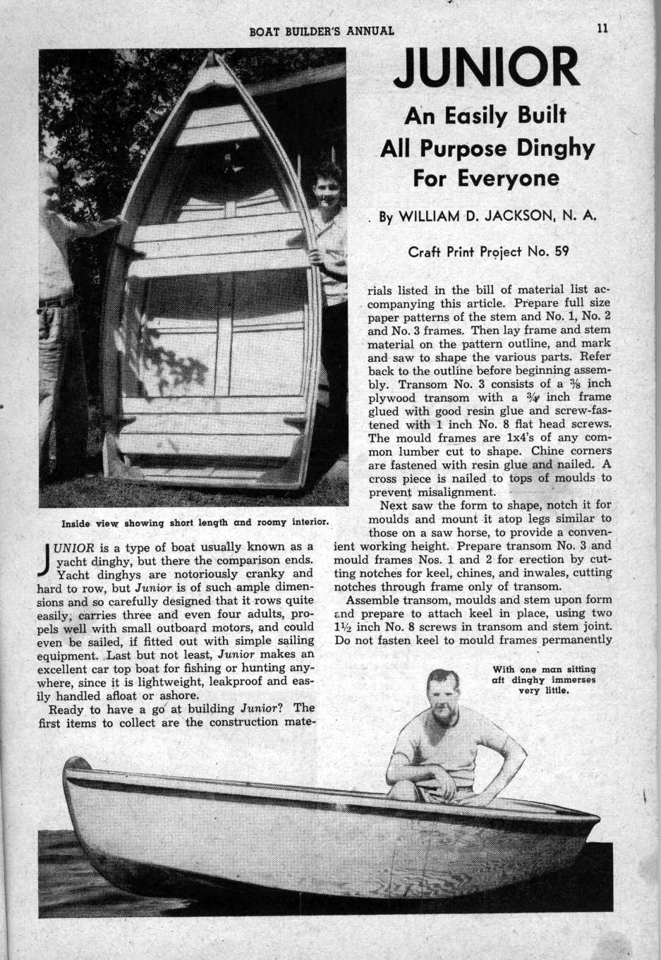 Junior - All Purpose Dinghy - By William D. Jackson. Junior is a type of boat usually known as a yacht dinghy, but there the comparison ends. Yacht dinghys are notoriously cranky and hard to row, but Junior is of such ample dimensions and so carefully designed that it rows quite easily, carries three and even four adults, propels well with small outboard motors, and could even be sailed, if fitted out with simple sailing equipment. Last but not least. Junior makes an excellent car top boat for fishing or hunting anywhere, since it is lightweight, leakproof and easily handled afloat or ashore.