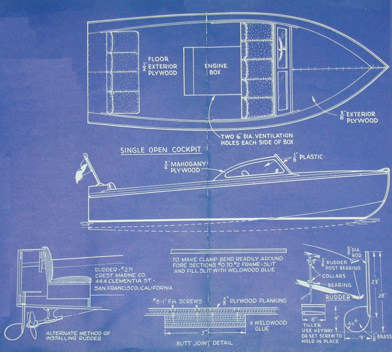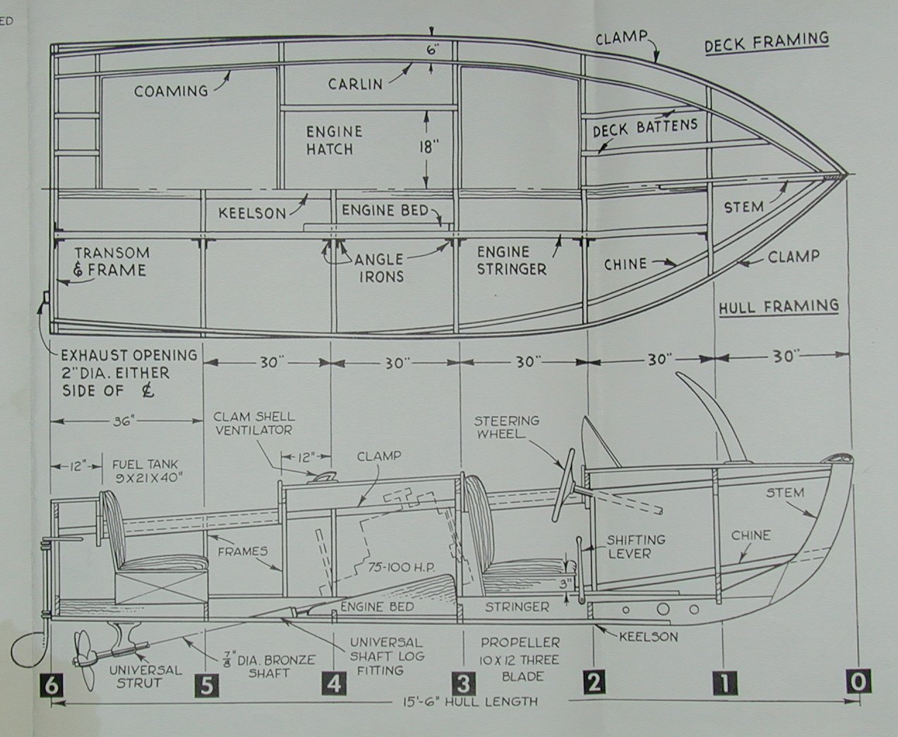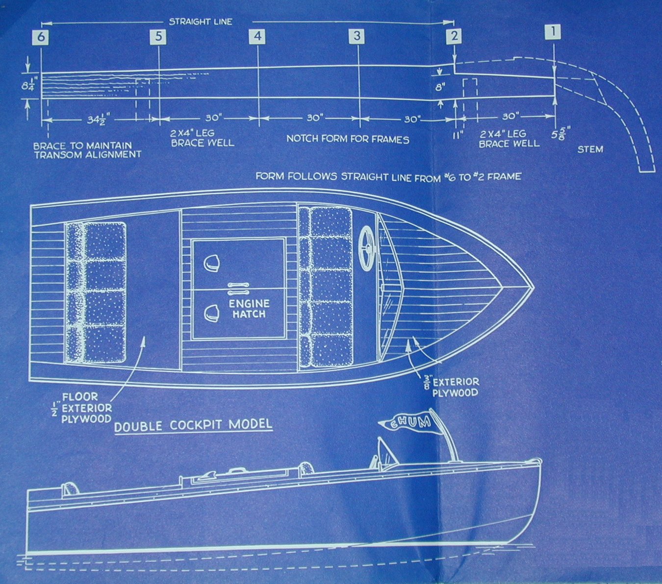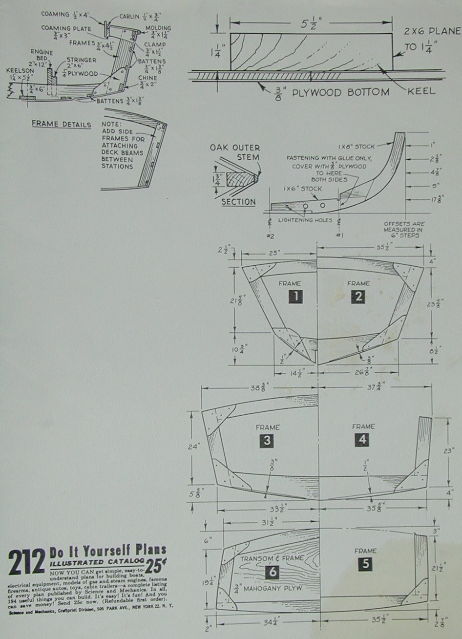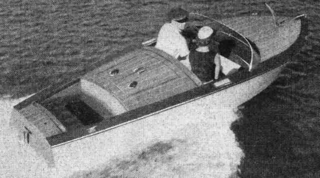 Chum - Speedy Inboard Runabout - By W. D. JACKSON. This convex bottom (hydroconic) runabout is 15 1/2 ft. long with a beam of 6 ft. and a maximum draft of 20 inches. You can use either a double cockpit or a single cockpit style for utility use. Chum was designed for use with a Marined Jeep Engine such as the Lehman Econ-O-Power, which develops 60 hp at 3400 rpm and will propel Chum at over 30 mph. Any 25-100 hp similar engine may also be used to power Chum, as long as the motor is of light weight, high speed design.