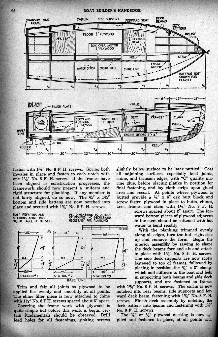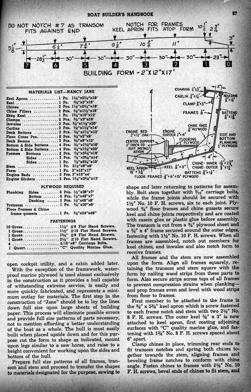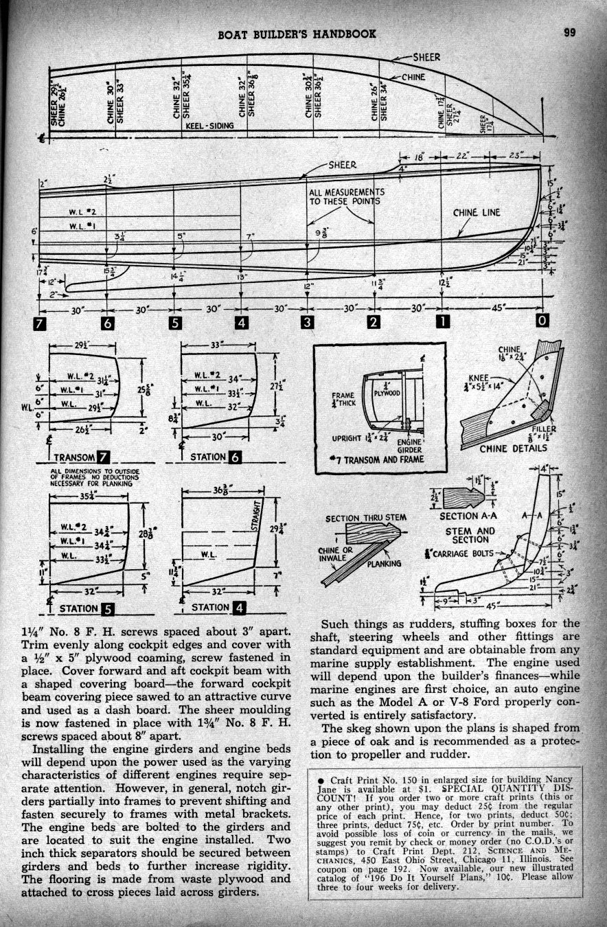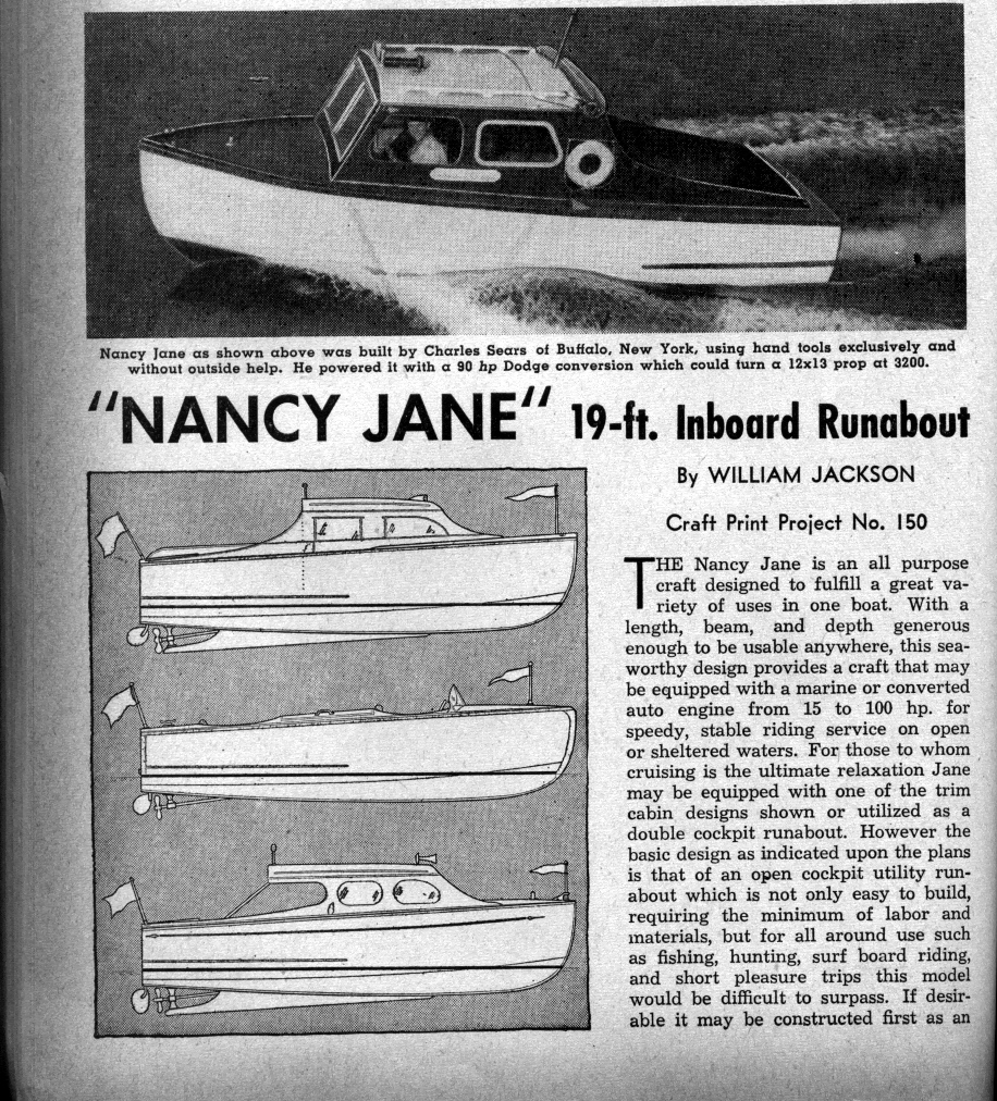 NANCY JANE - 19 ft. Inboard Runabout - By William D. Jackson. The Nancy Jane is an all purpose craft designed to fulfill a great variety of uses in one boat. With a length, beam, and depth generous enough to be usable anywhere, this seaworthy design provides a craft that may be equipped with a marine or converted auto engine from 15 to 100 hp. for speedy, stable riding service on open or sheltered waters. For those to whom cruising is the ultimate relaxation Nancy Jane may be equipped with one of the trim cabin designs shown or utilized as a double cockpit runabout. However the basic design as indicated upon the plans is that of an open cockpit utility run- about which is not only easy to build, requiring the minimum of labor and materials, but for all around use such as fishing, hunting, surf board riding, and short pleasure trips this model would be difficult to surpass.
