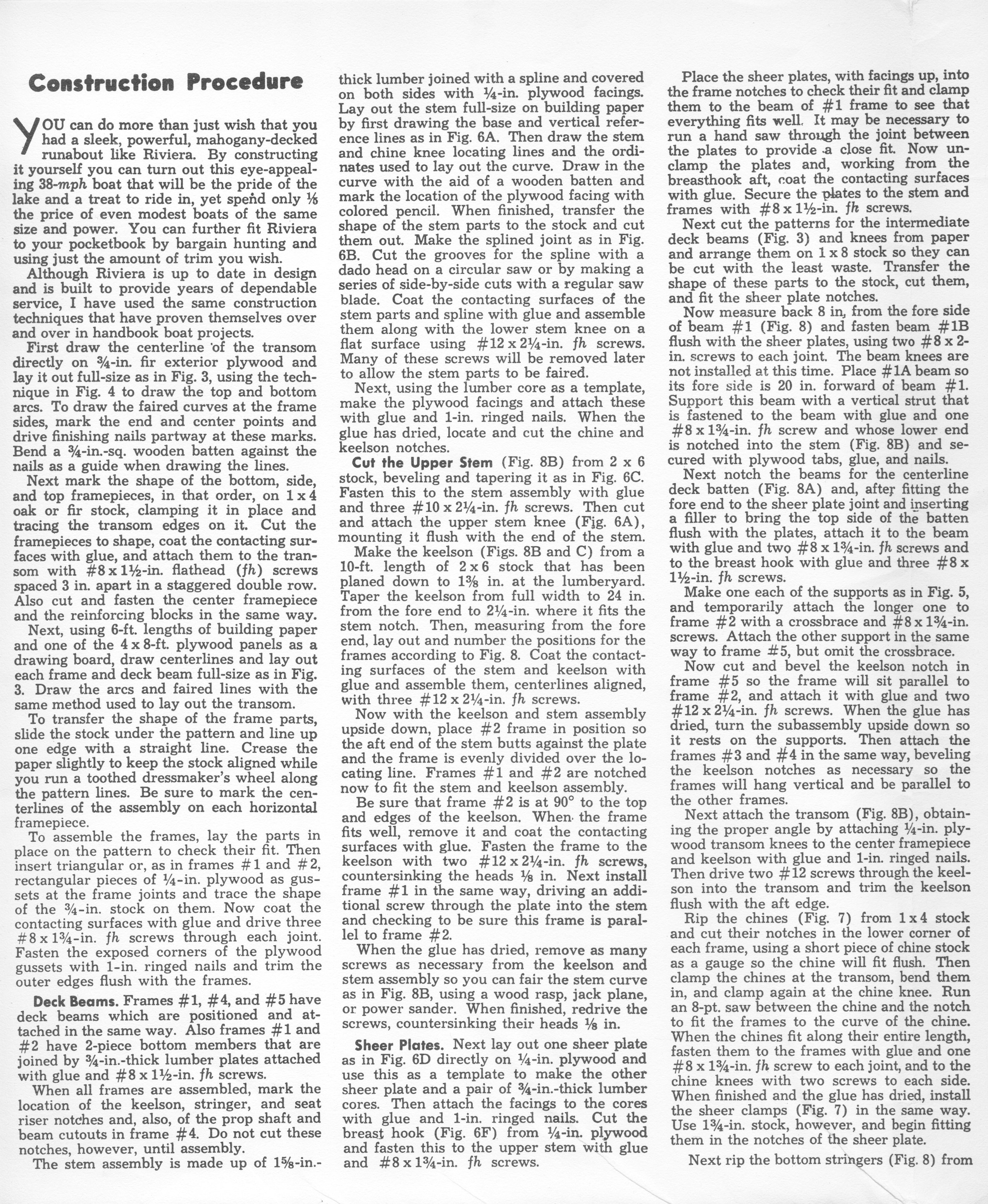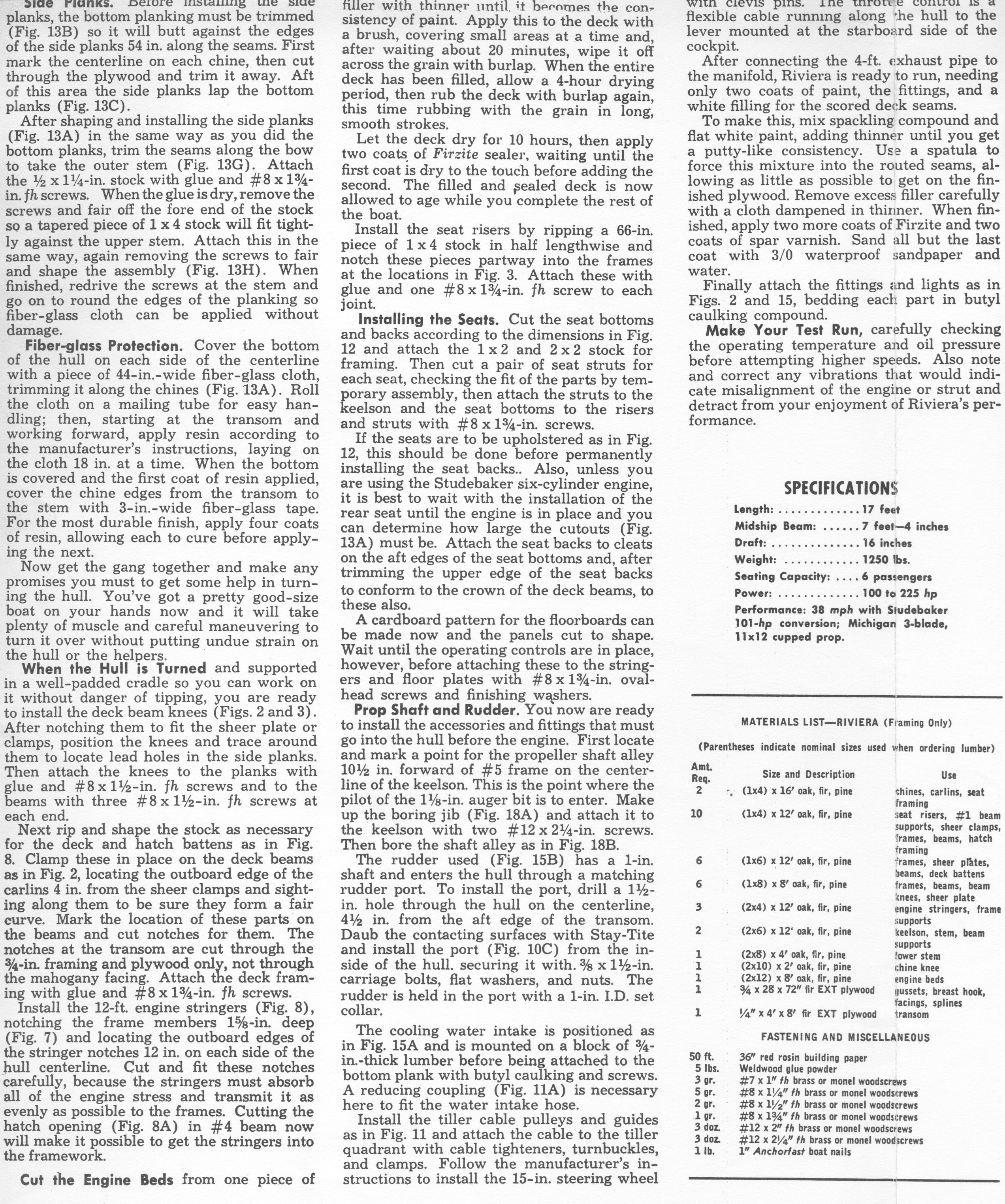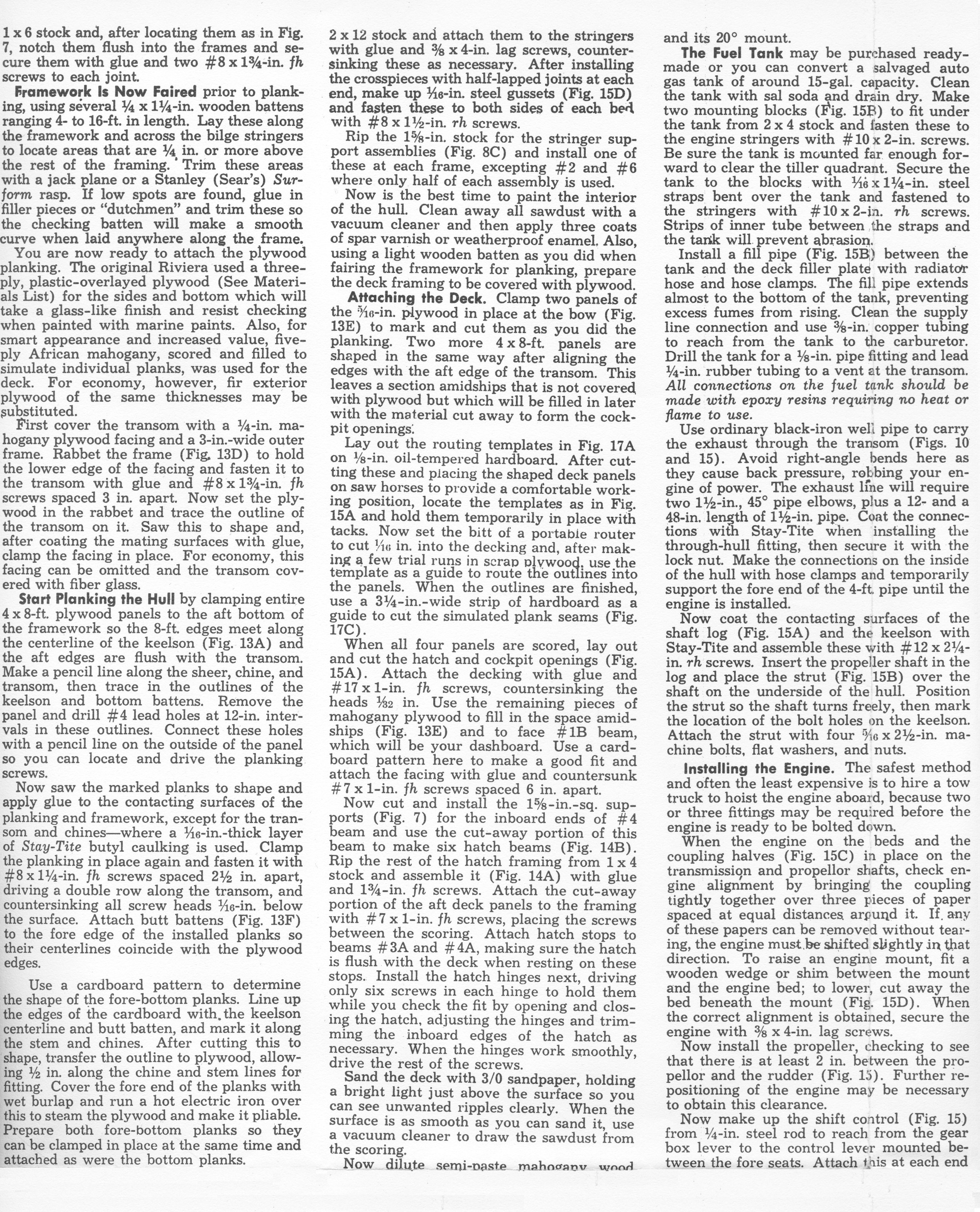 RIVIERA - 17 Ft. Inboard Runabout - By William D. Jackson. You can do more than just wish that you had a sleek, powerful, mahogany decked runabout like Riviera. By constructing it yourself you can turn out this eye appealing 38-mph boat that will be the pride of the lake and a treat to ride in, yet spend only a fraction the price of even modest boats of the same size and power. You can further fit Riviera to your pocketbook by bargain hunting and using just the amount of trim you wish.