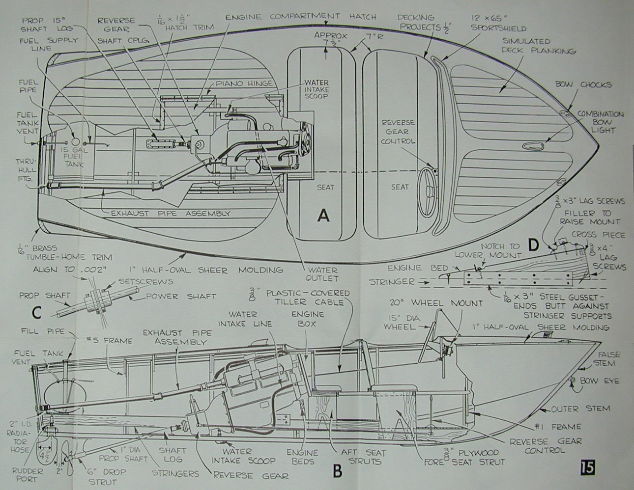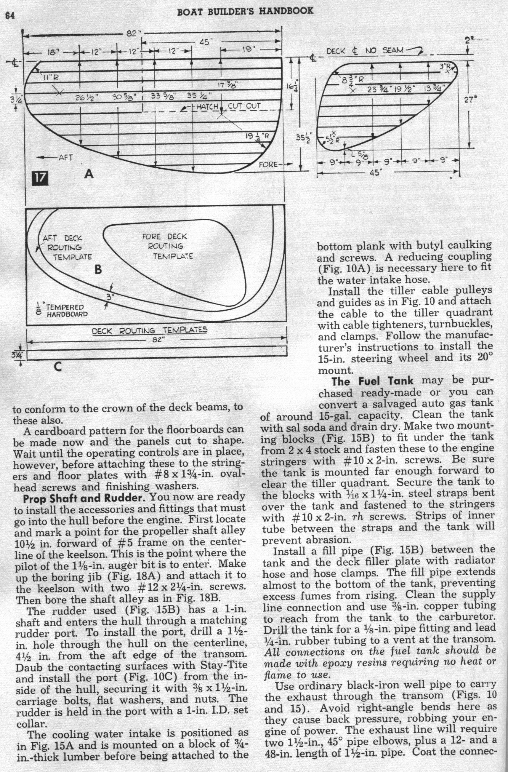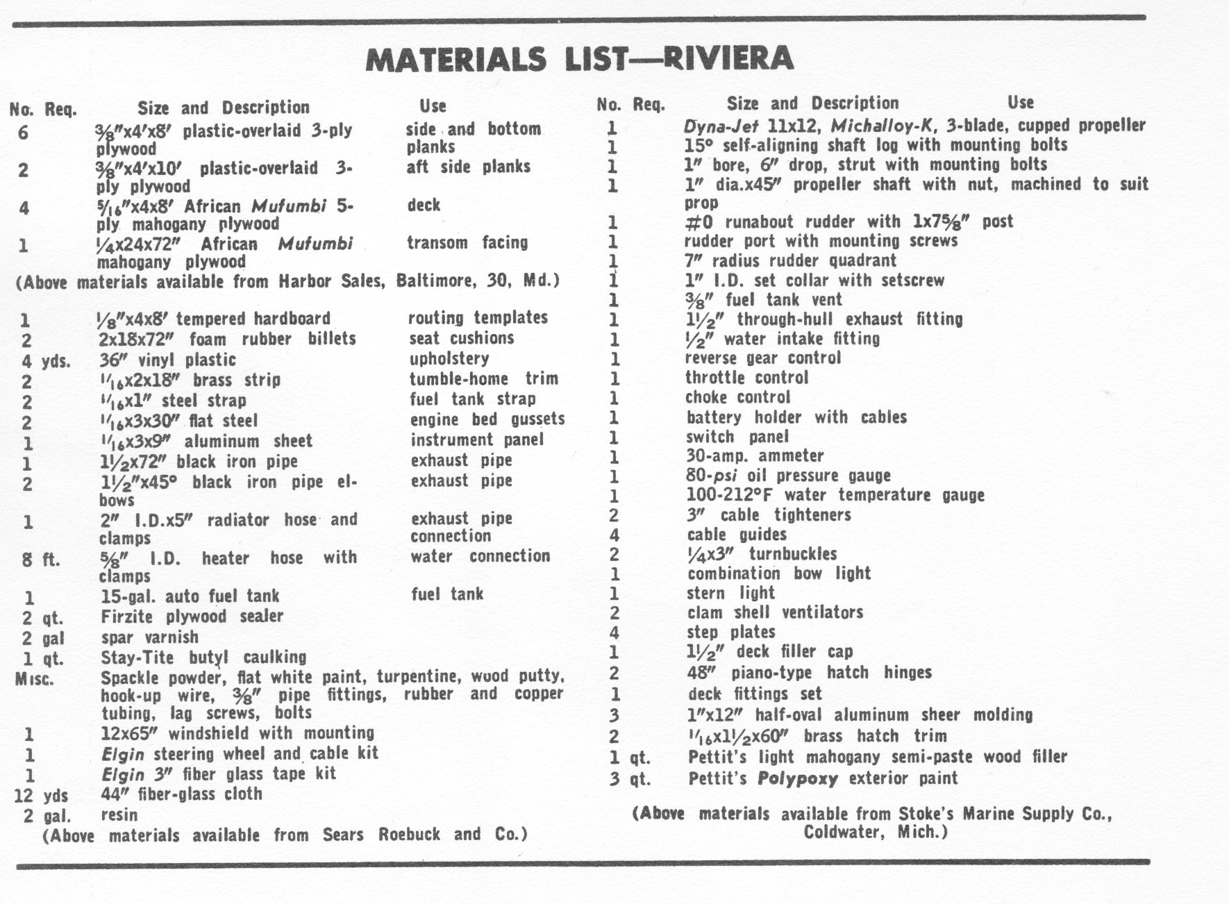 RIVIERA - 17 Ft. Inboard Runabout - By William D. Jackson. You can do more than just wish that you had a sleek, powerful, mahogany decked runabout like Riviera. By constructing it yourself you can turn out this eye appealing 38-mph boat that will be the pride of the lake and a treat to ride in, yet spend only a fraction the price of even modest boats of the same size and power. You can further fit Riviera to your pocketbook by bargain hunting and using just the amount of trim you wish.